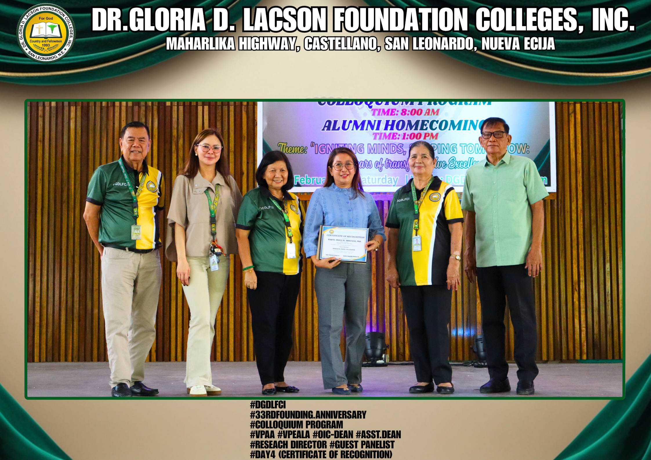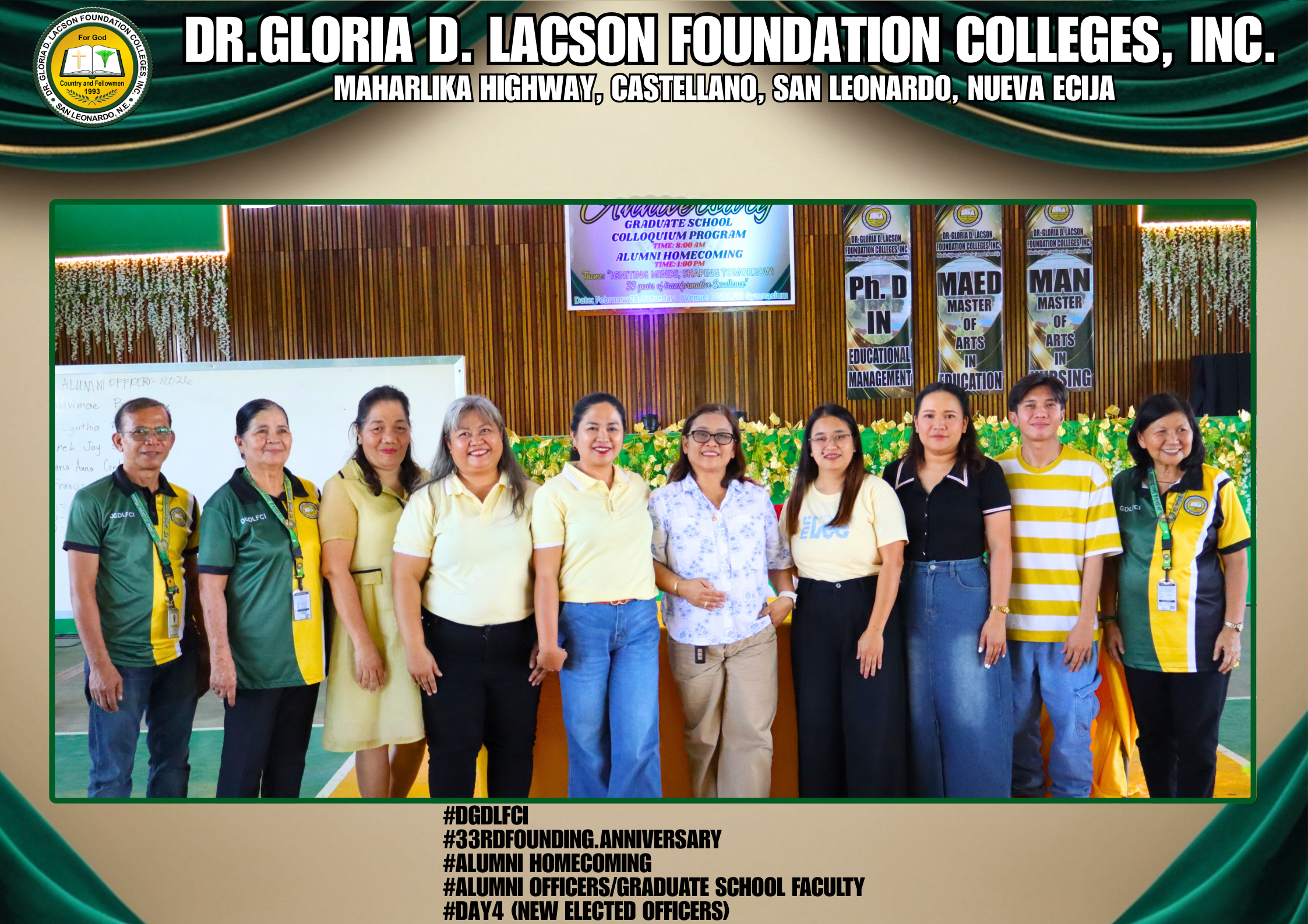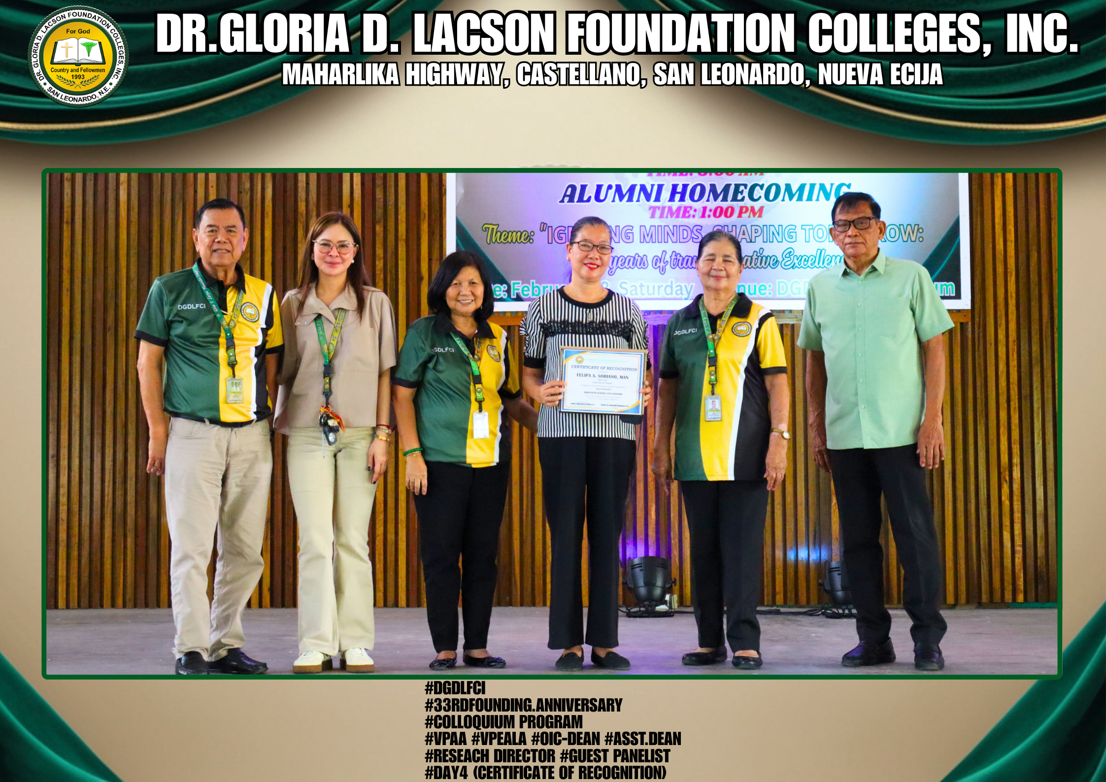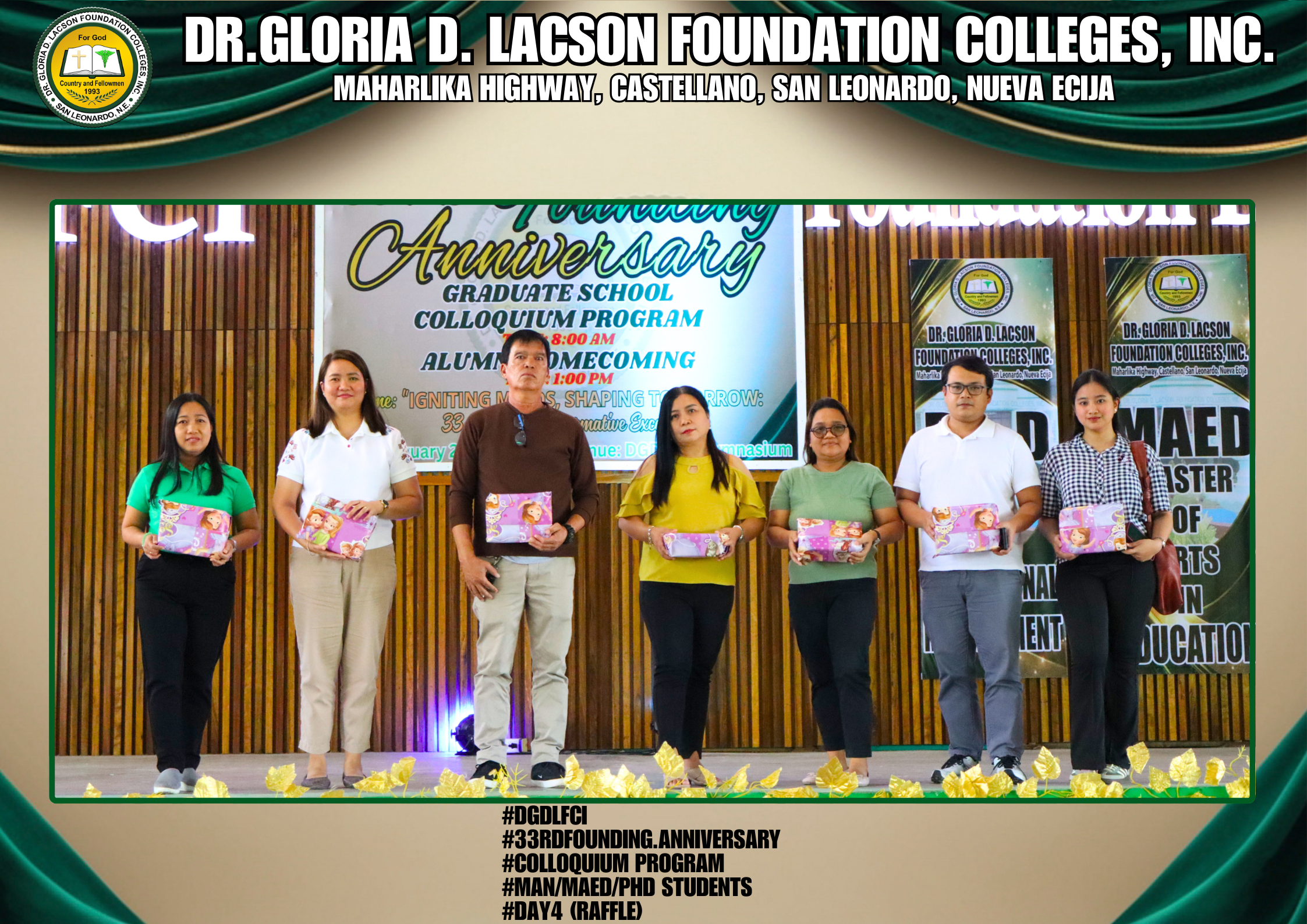 The fourth day of the 33rd Founding Anniversary celebration of Dr. Gloria D. Lacson Foundation Colleges, Inc. was held on February 28, 2026, at the DGDLFCI Gymnasium, continuing the meaningful celebration with activities that highlighted academic excellence and lasting connections among members of the DGDLFCI community. Guided by the theme “IGNITING MINDS,SHAPING TOMORROW: 33 years of transformative Excellence,” the day began with the Colloquium Program of the Graduate School Department, where graduate students shared their research, insights, and academic outputs, reflecting their dedication to professional growth and scholarly advancement.