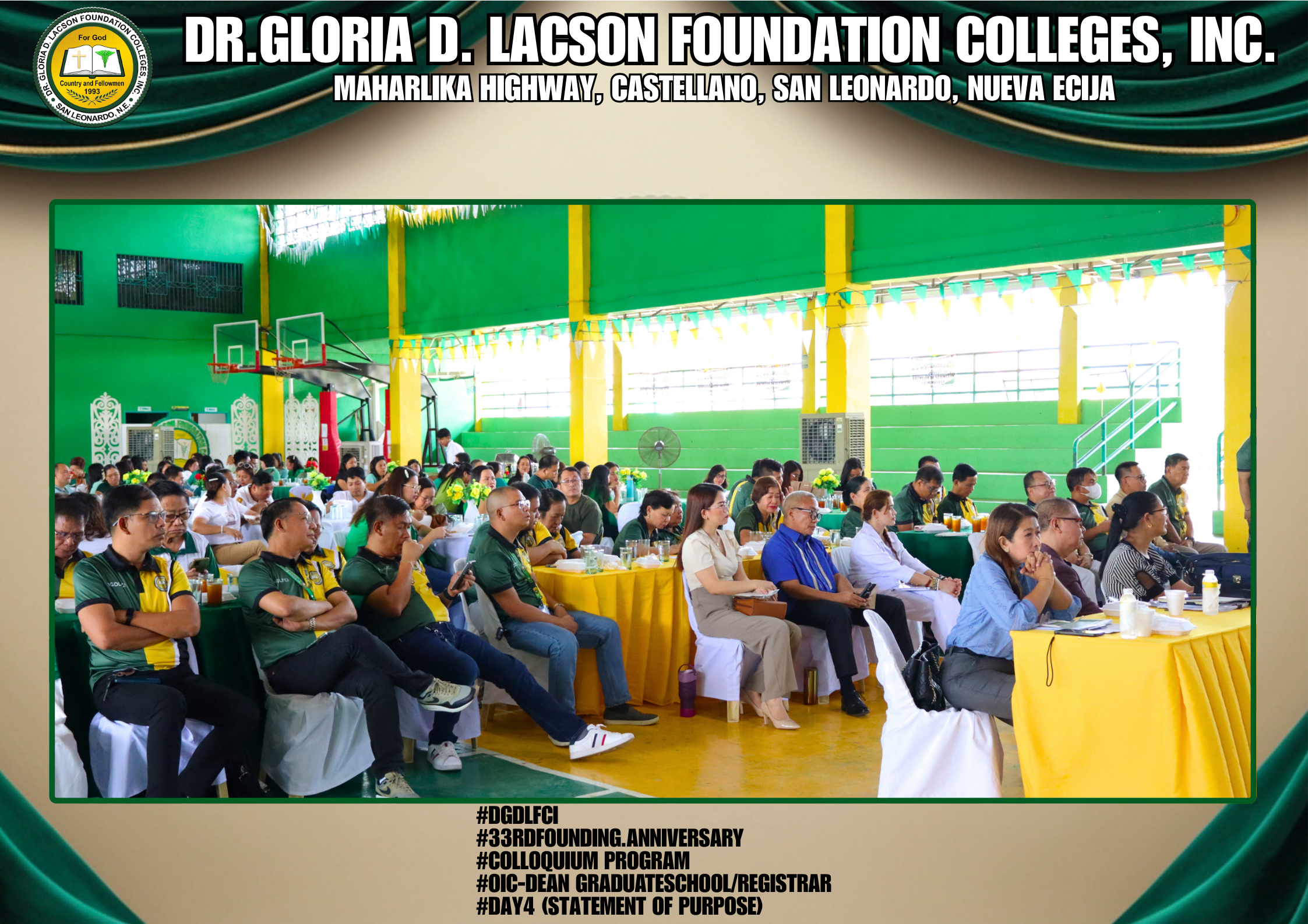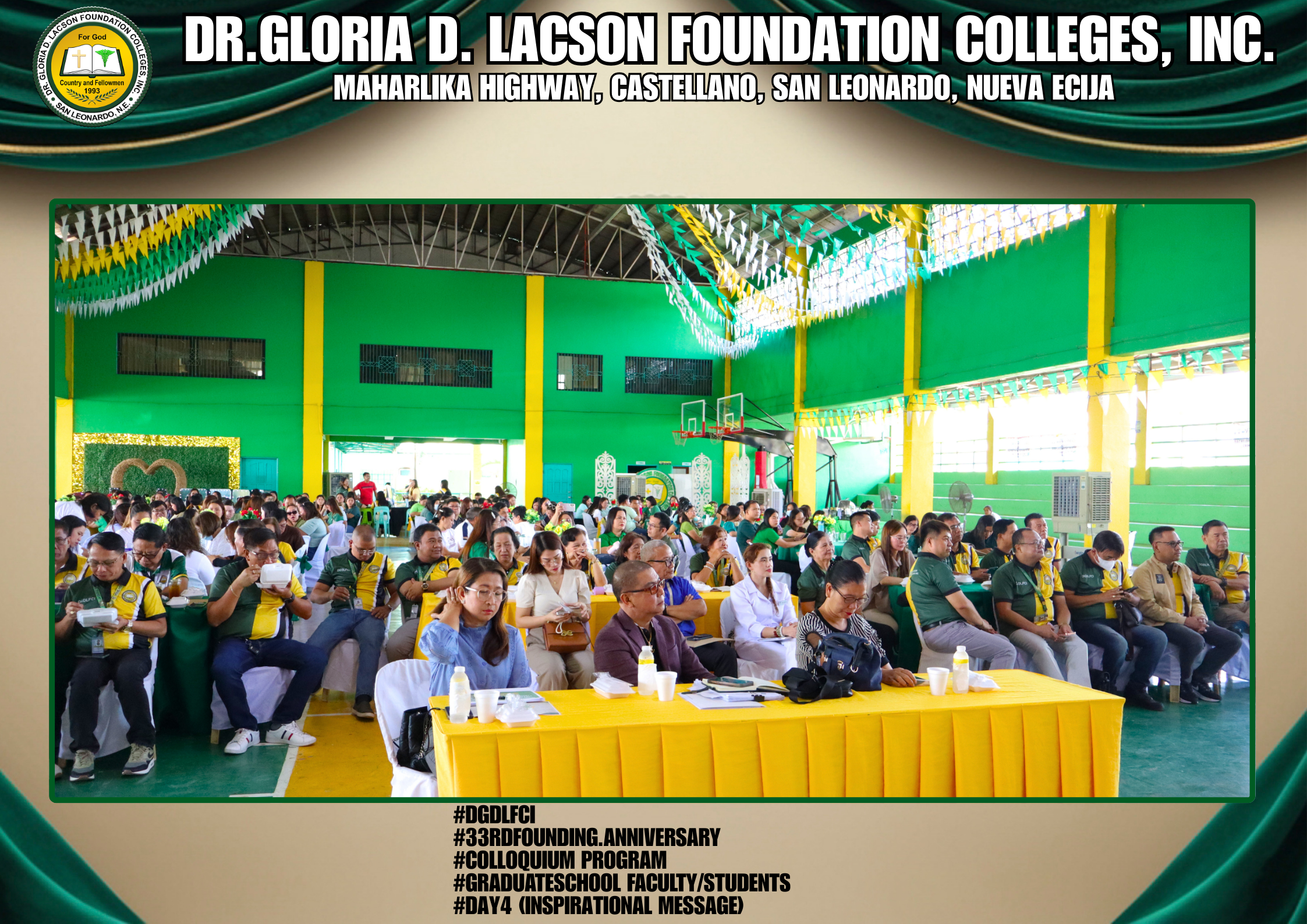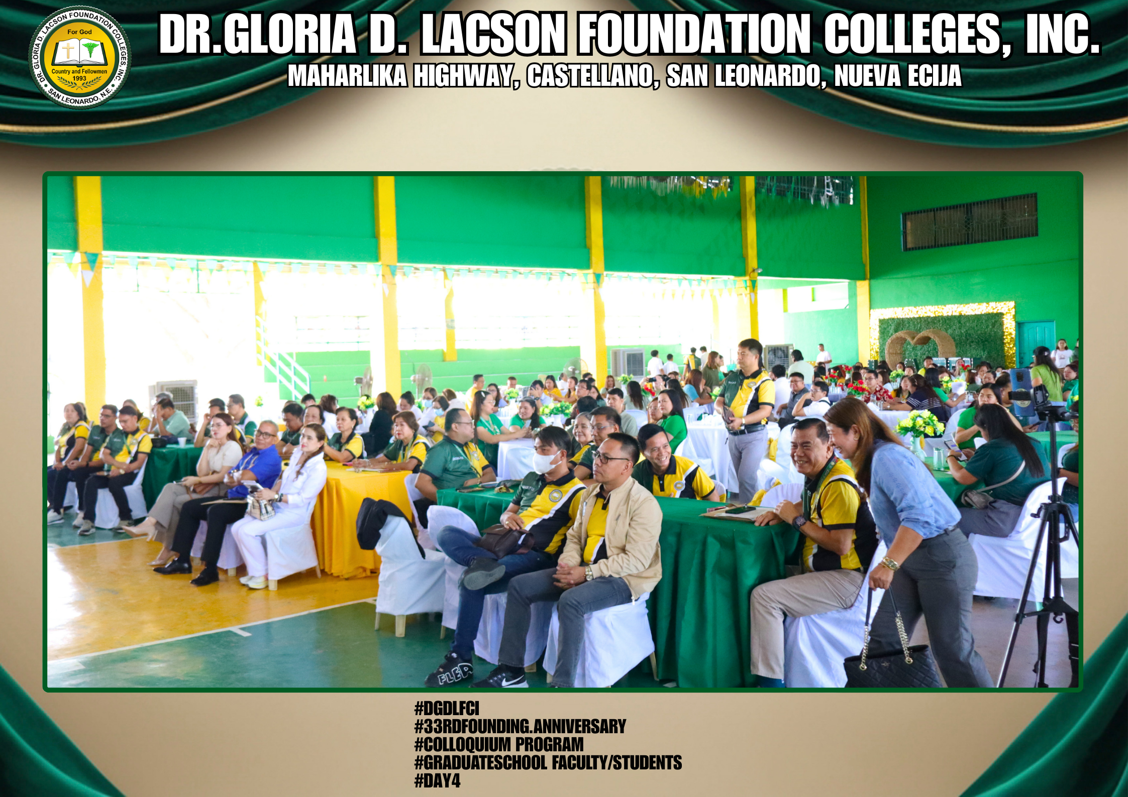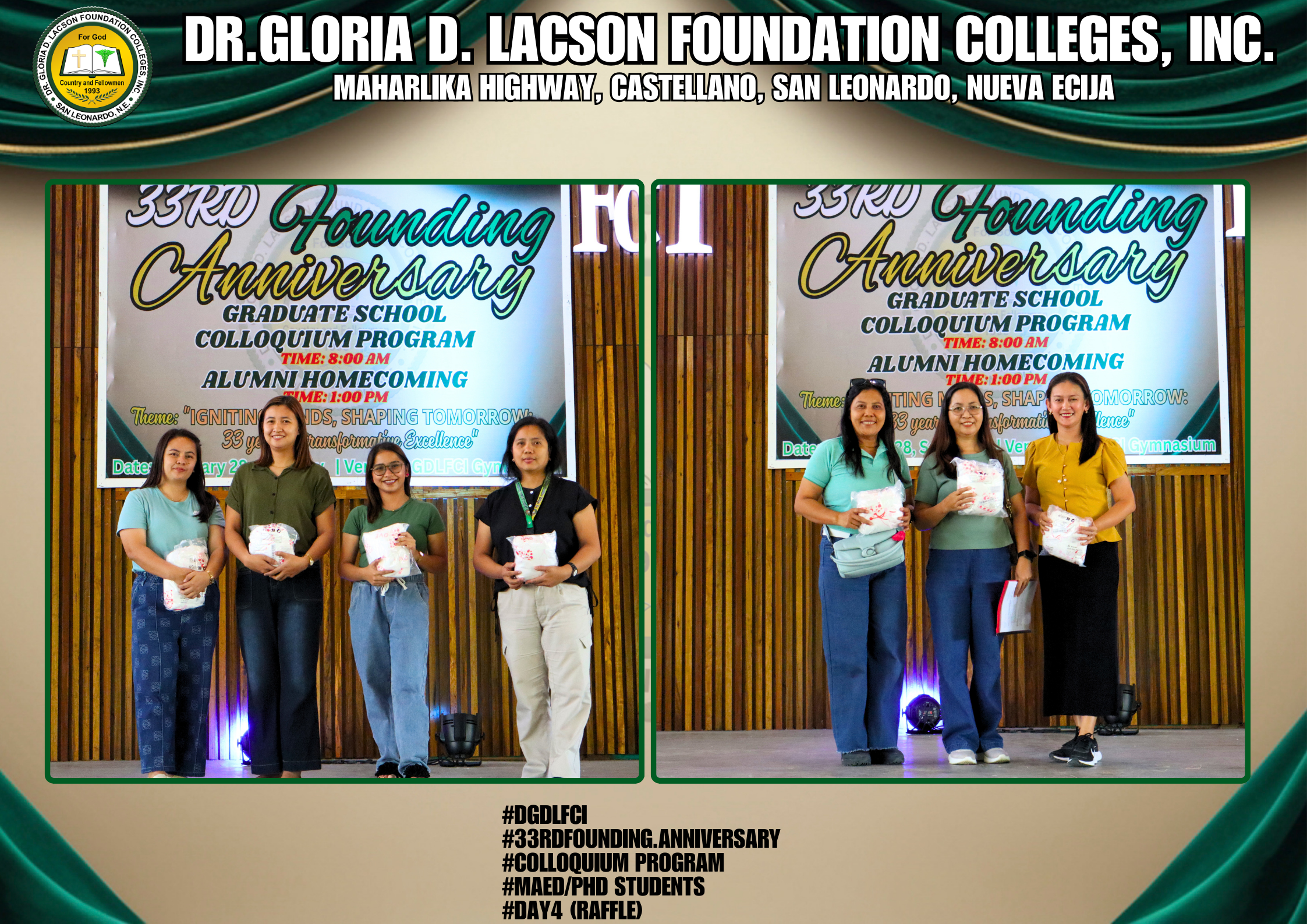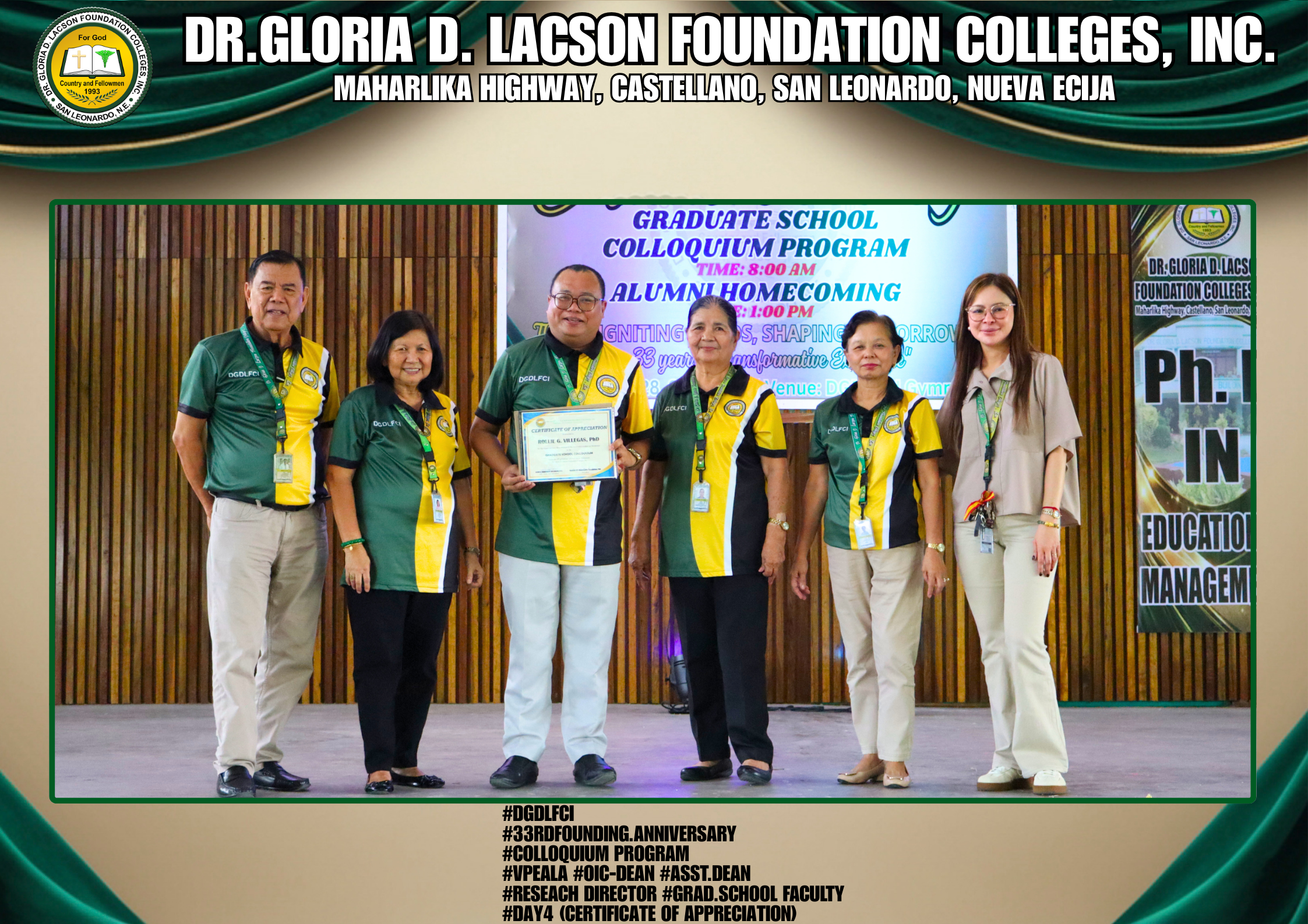 The fourth day of the 33rd Founding Anniversary celebration of Dr. Gloria D. Lacson Foundation Colleges, Inc. was held on February 28, 2026, at the DGDLFCI Gymnasium, continuing the meaningful celebration with activities that highlighted academic excellence and lasting connections among members of the DGDLFCI community. Guided by the theme “IGNITING MINDS,SHAPING TOMORROW: 33 years of transformative Excellence,” the day began with the Colloquium Program of the Graduate School Department, where graduate students shared their research, insights, and academic outputs, reflecting their dedication to professional growth and scholarly advancement.