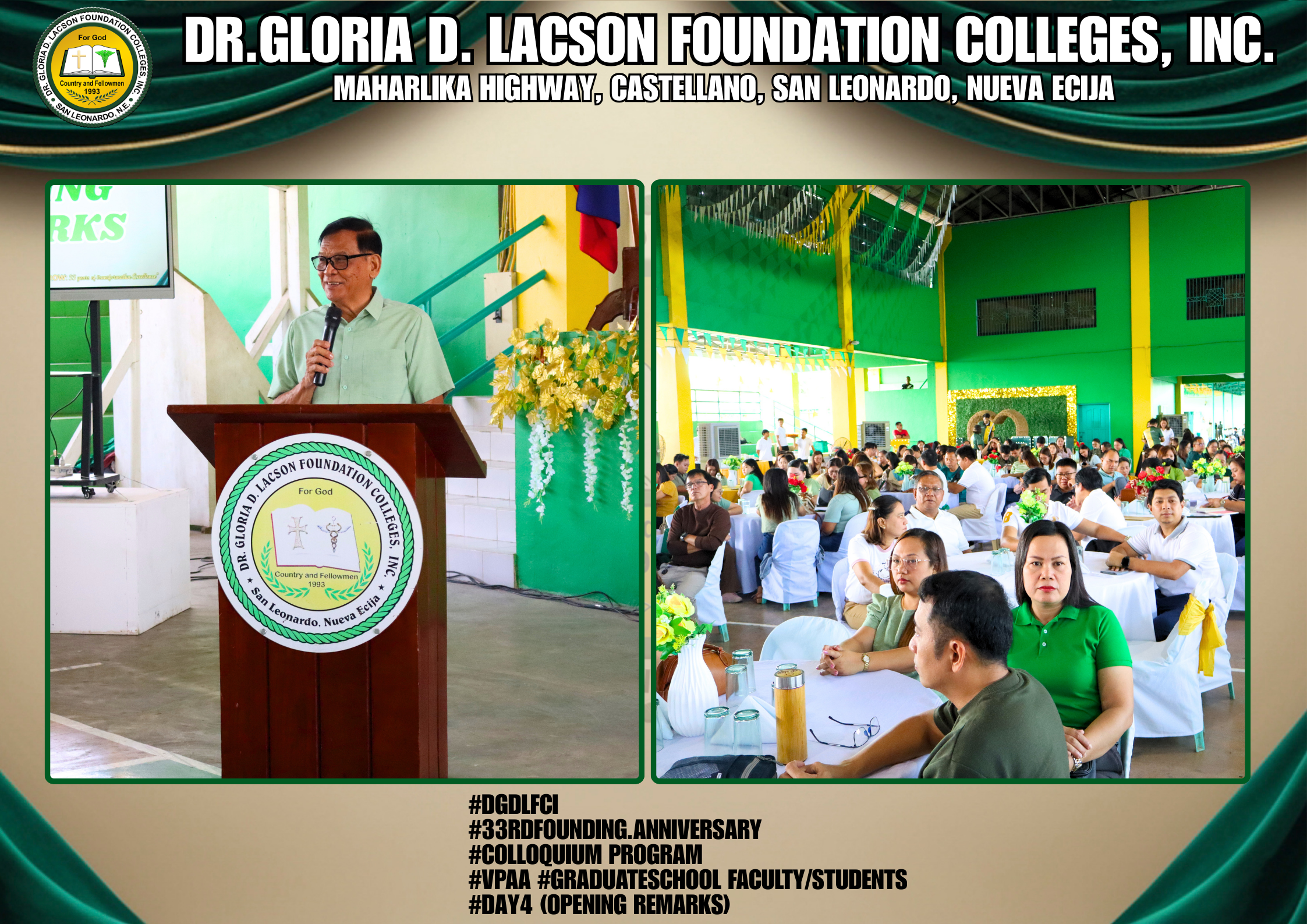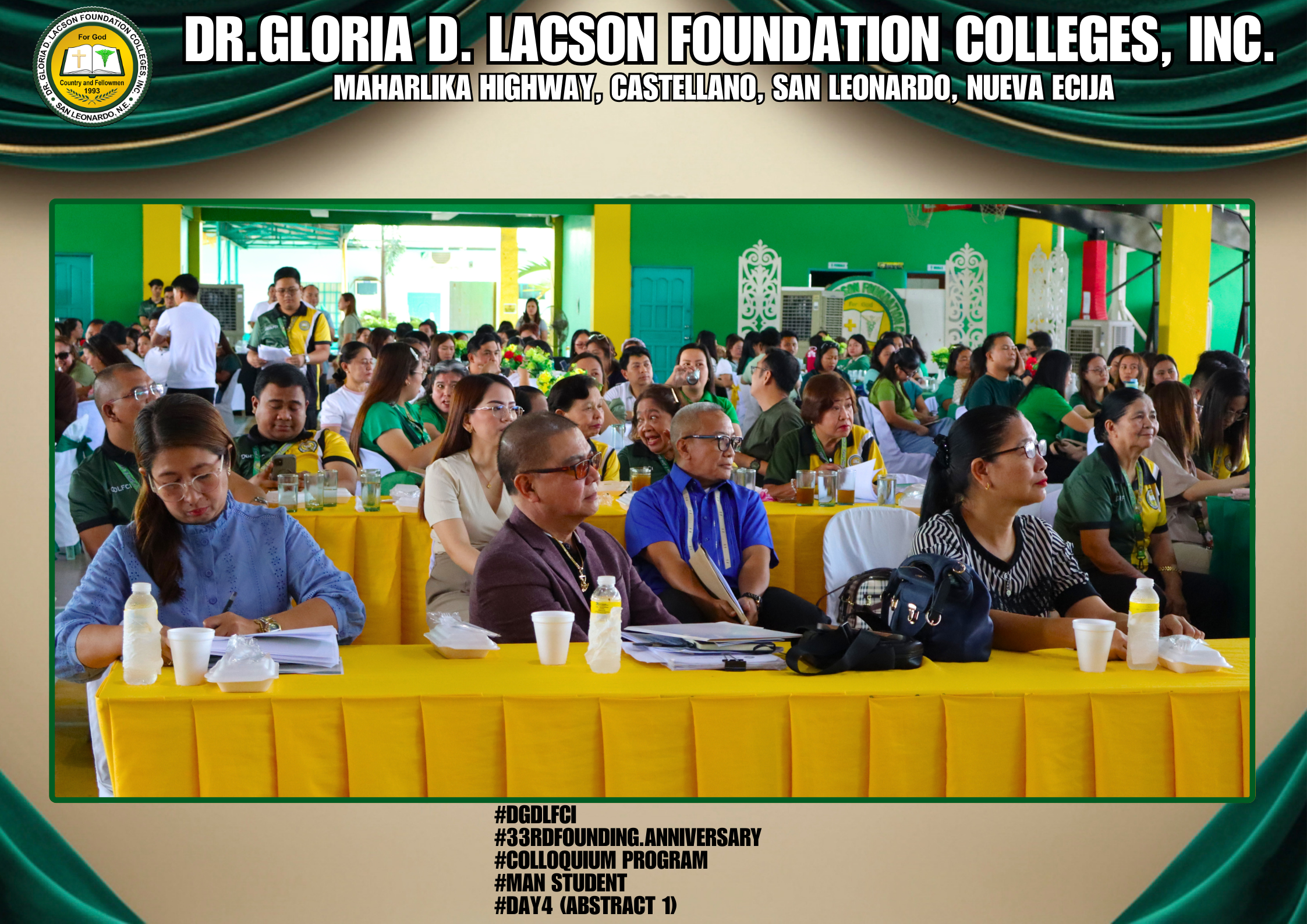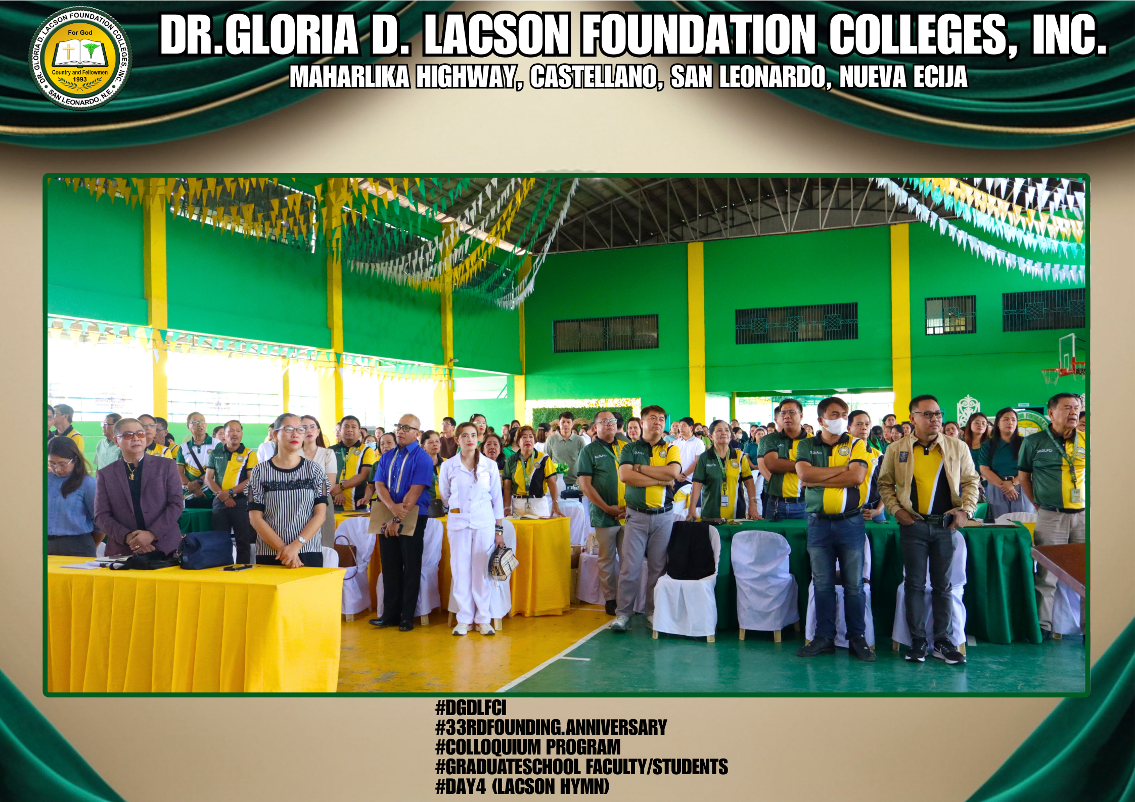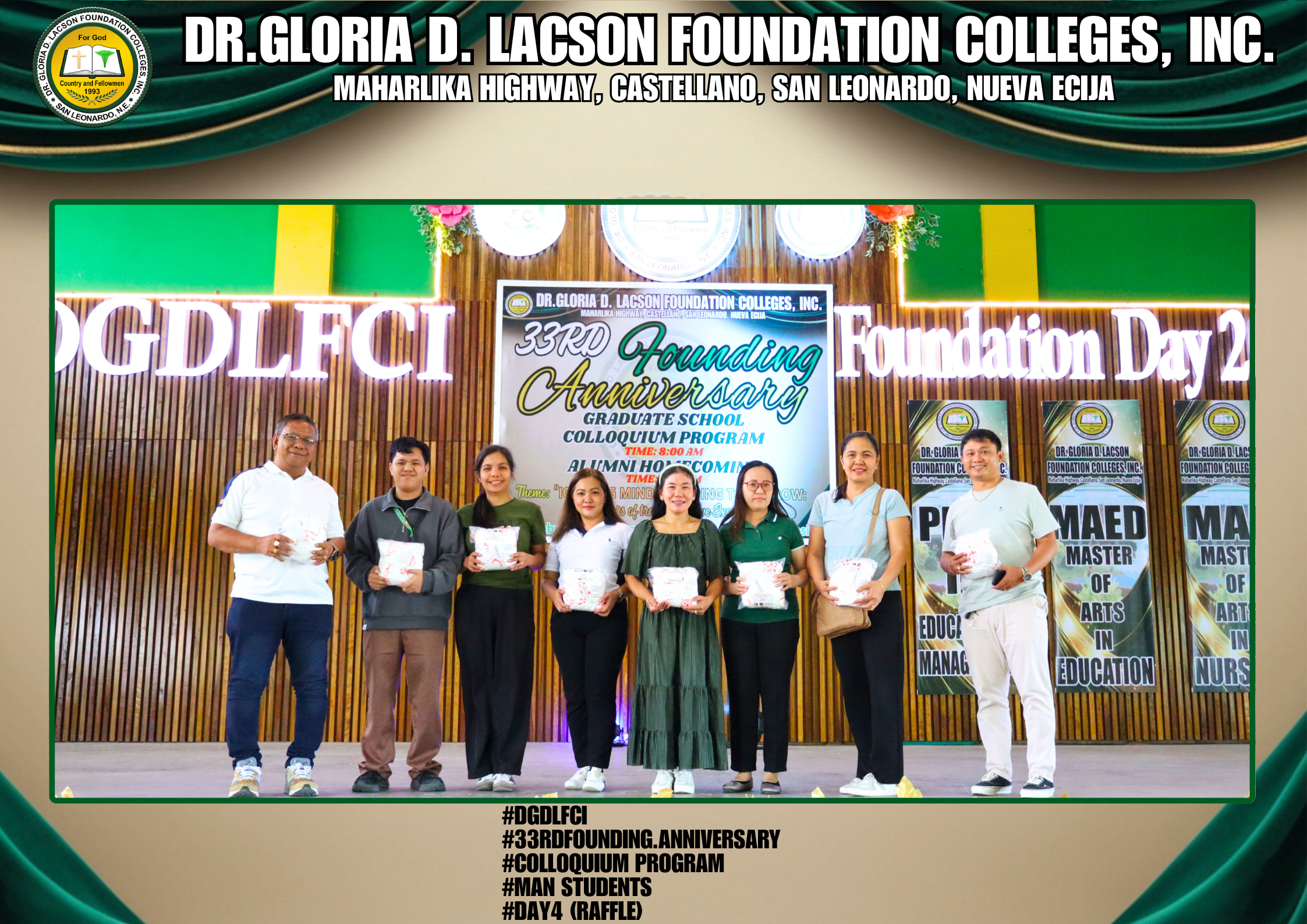 The fourth day of the 33rd Founding Anniversary celebration of Dr. Gloria D. Lacson Foundation Colleges, Inc. was held on February 28, 2026, at the DGDLFCI Gymnasium, continuing the meaningful celebration with activities that highlighted academic excellence and lasting connections among members of the DGDLFCI community. Guided by the theme “IGNITING MINDS,SHAPING TOMORROW: 33 years of transformative Excellence,” the day began with the Colloquium Program of the Graduate School Department, where graduate students shared their research, insights, and academic outputs, reflecting their dedication to professional growth and scholarly advancement.
