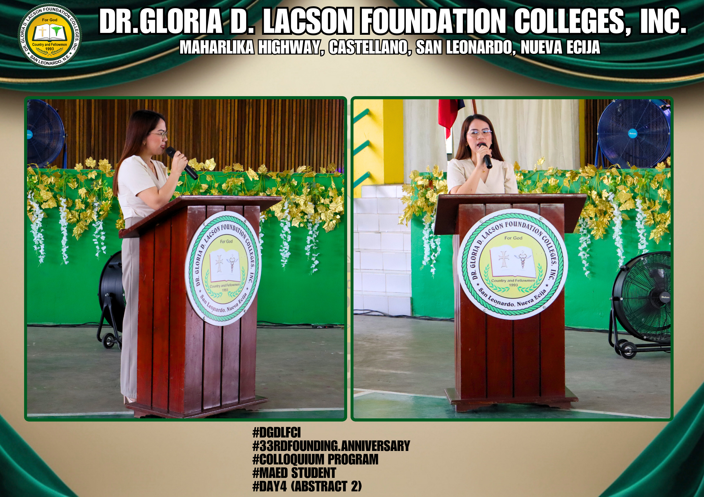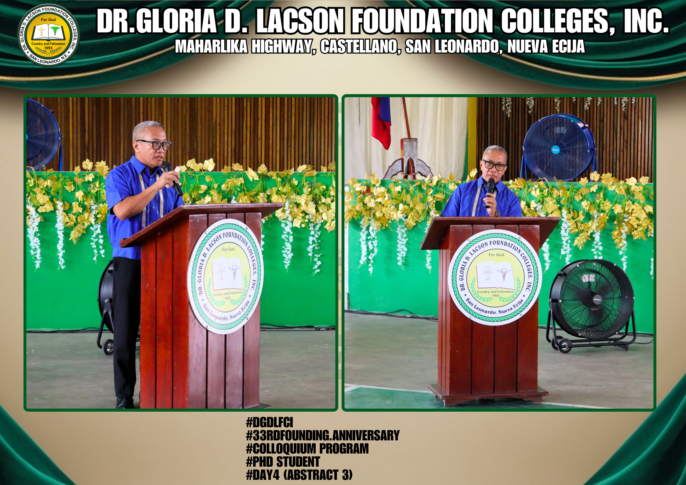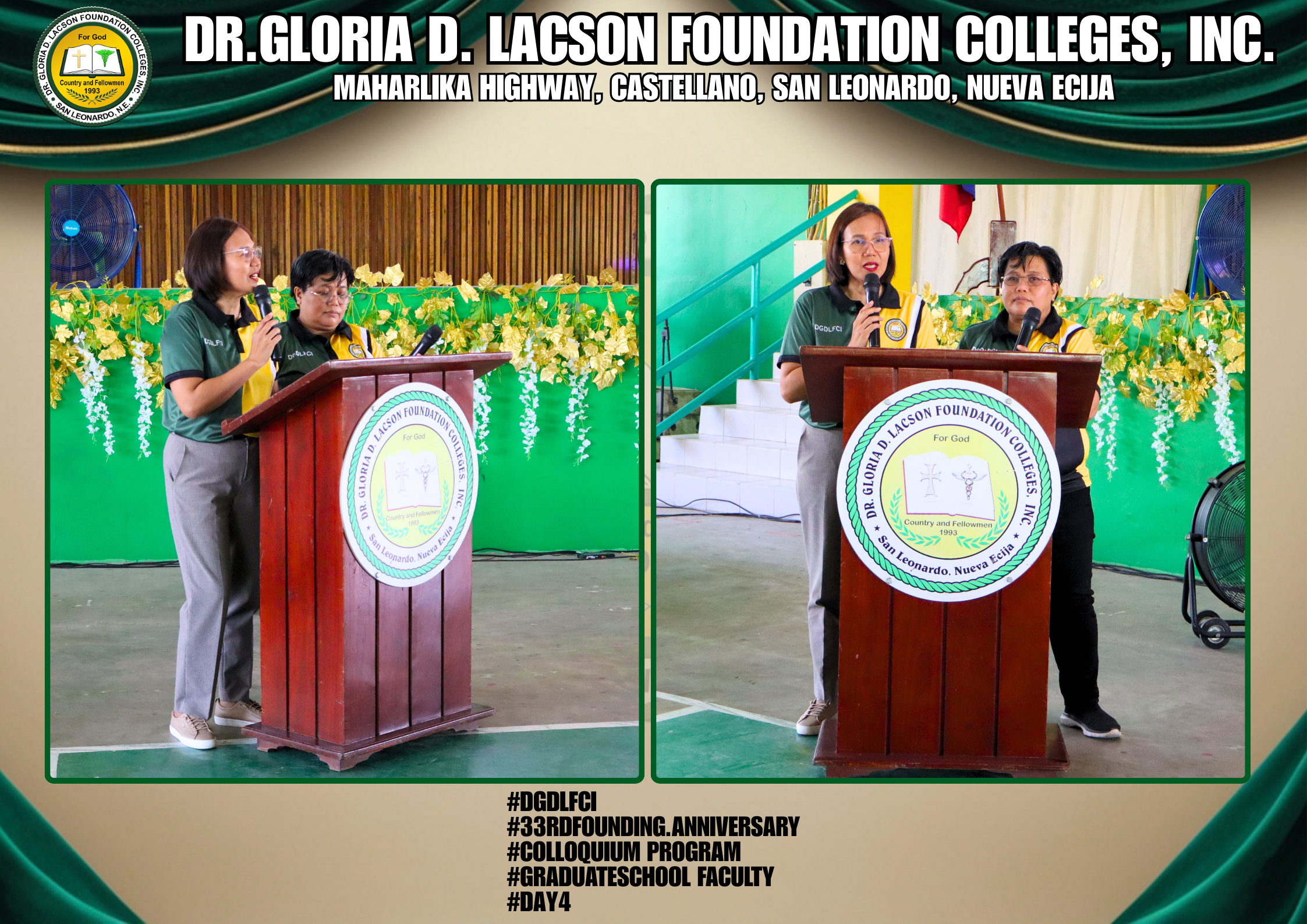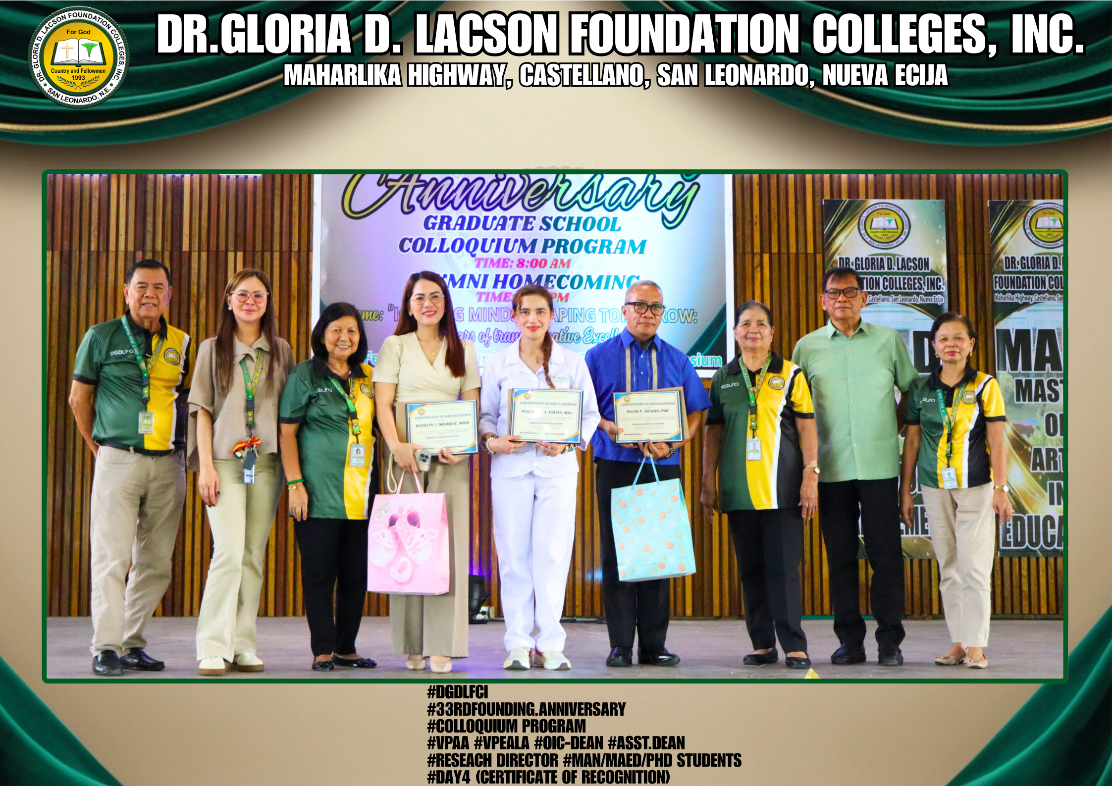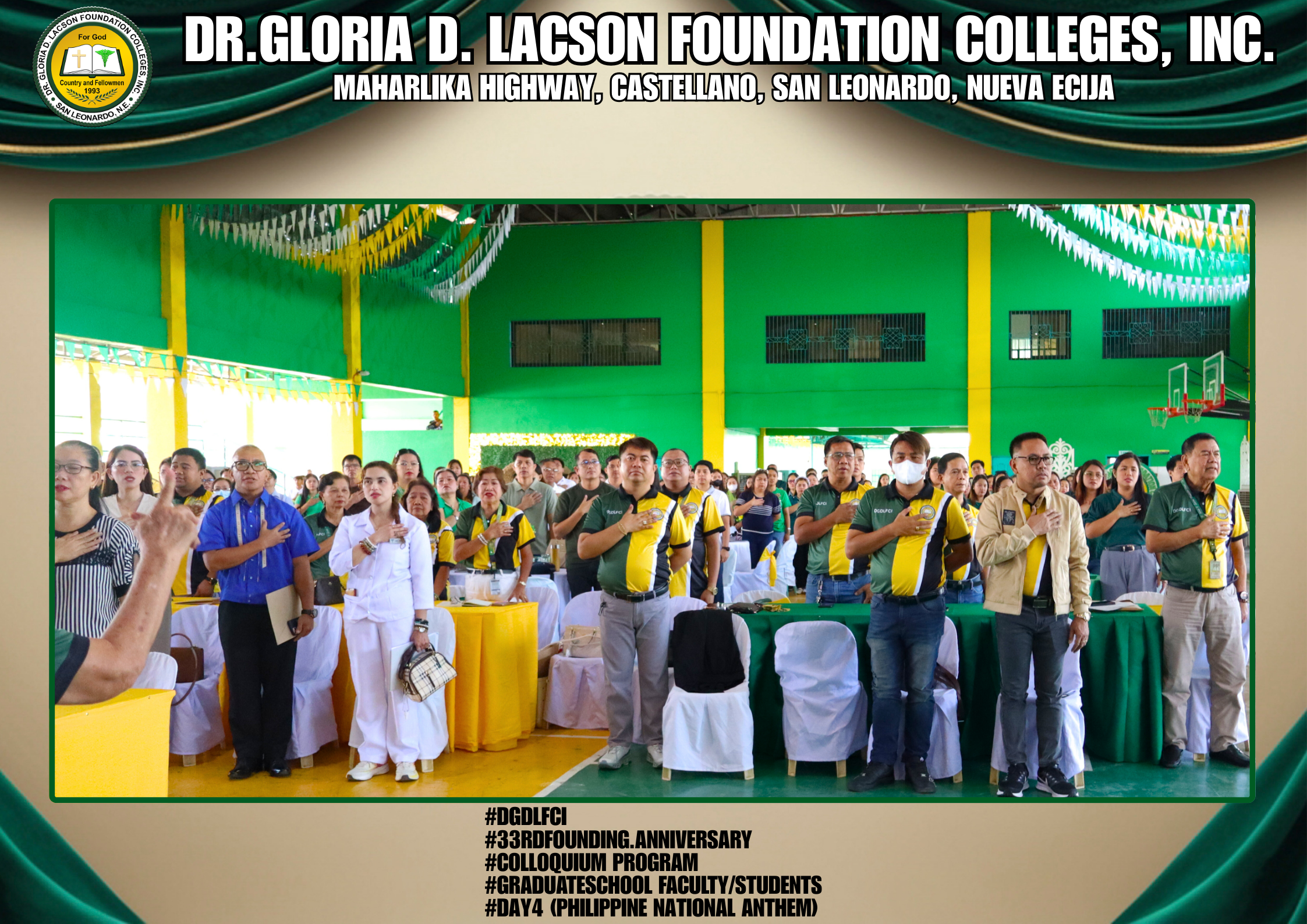 The fourth day of the 33rd Founding Anniversary celebration of Dr. Gloria D. Lacson Foundation Colleges, Inc. was held on February 28, 2026, at the DGDLFCI Gymnasium, continuing the meaningful celebration with activities that highlighted academic excellence and lasting connections among members of the DGDLFCI community. Guided by the theme “IGNITING MINDS,SHAPING TOMORROW: 33 years of transformative Excellence,” the day began with the Colloquium Program of the Graduate School Department, where graduate students shared their research, insights, and academic outputs, reflecting their dedication to professional growth and scholarly advancement.