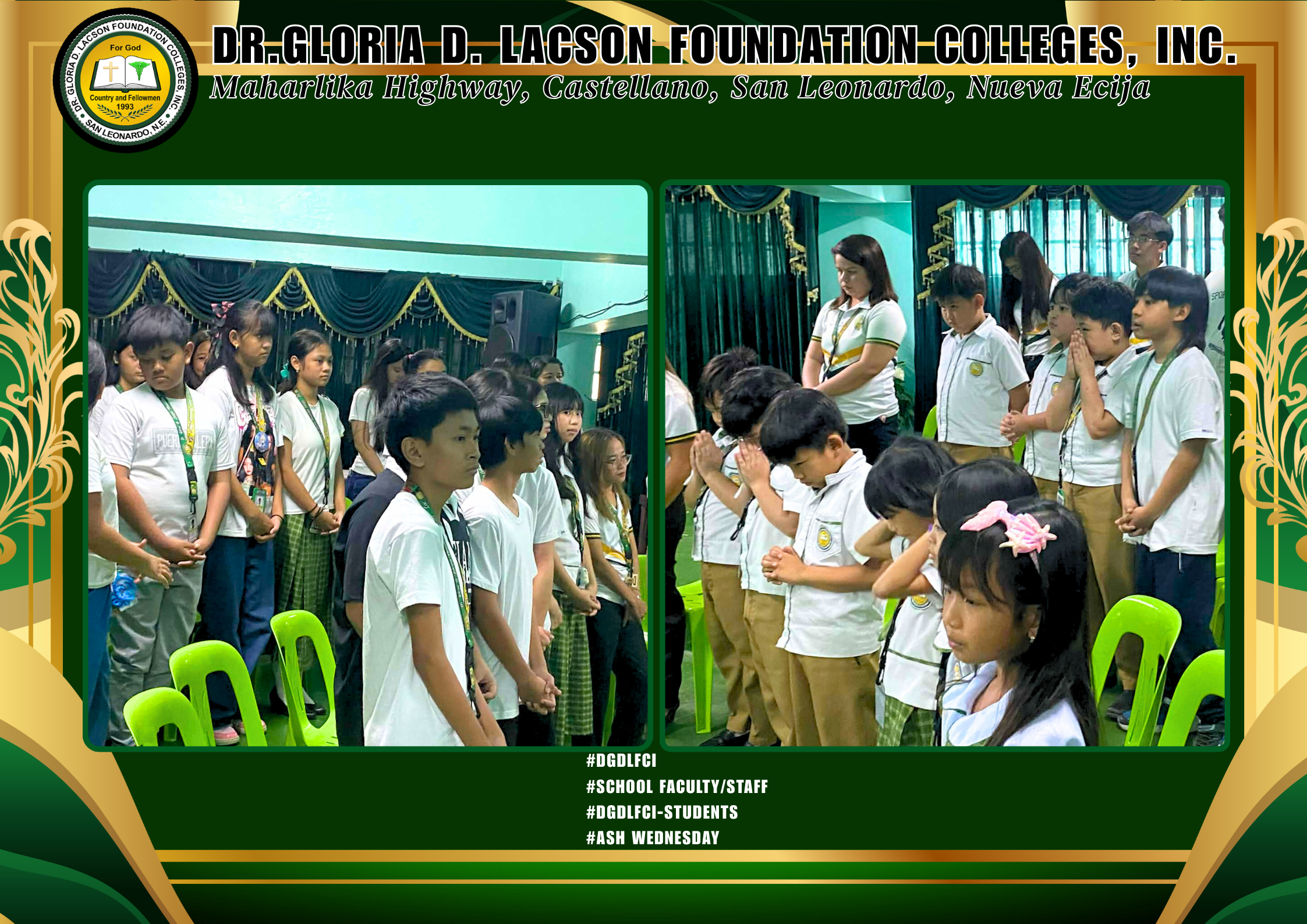 In solemn observance of Ash Wednesday, the Basic Education Faculty, staff, and students of Dr. Gloria D. Lacson Foundation Colleges, Inc. gathered last February 18, 2026, at the DGDLFCI Amphitheater to begin the Lenten season with prayer, reflection, and repentance. Marked with ashes as a symbol of humility and renewal, the DGDLFCI community united in faith, embracing this sacred time for spiritual growth, sacrifice, and deeper commitment to God. May this Lenten journey inspire everyone to walk in compassion, forgiveness, and grace.